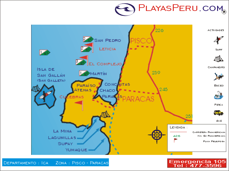 Playa de San Gallan Playa Paraiso Playa Atenas Playa Culebras Playa Paracas Playa Chaco Playa Conchitas Playa Martin Playa El Complejo Playa Leticia Playa San Pedro Playa Yumaque Playa Supay Playa lagunillas Playa La Mina